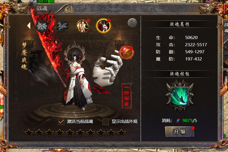 3、激活战魂可获得大量属性以及强力buff:攻击时有概率释放“断魂斩”,对当前目标施加1.5秒的“断魂”效果:断魂状态下,目标及其分身无法释放任意技能且无法移动,同时受到的一切伤害提升15%,激活后永久生效